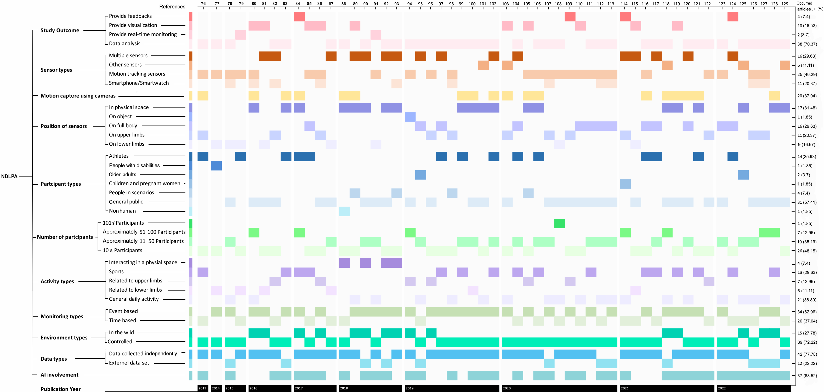 Results: Out of 1501 initially identified studies, 54 (3.66%) were included for in-depth analysis. These articles predominantly used accelerometer and gyroscope sensors (n=43, 80%) to monitor and analyze motion, demonstrating a strong preference for these technologies in capturing both dynamic and static activities. While incorporating portable devices (n=11, 20%) and multisensor configurations (n=16, 30%), the application of sensors across the body (n=15, 28%) and within physical spaces (n=17, 31%) highlights the diverse applications of motion tracking technologies in health care research. This diversity reflects the application’s alignment with activity types ranging from daily movements to specialized scenarios. The results also reveal a diverse participant pool, including the general public, athletes, and specialized groups, with a focus on healthy individuals (n=31, 57%) and athletes (n=14, 26%). Despite this extensive application range, the focus primarily on laboratory-based studies (n=39, 72%) aimed at professional uses, such as precise activity identification and joint functionality assessment, emphasizes a significant challenge in translating findings from controlled environments to the dynamic conditions of everyday physical activities.